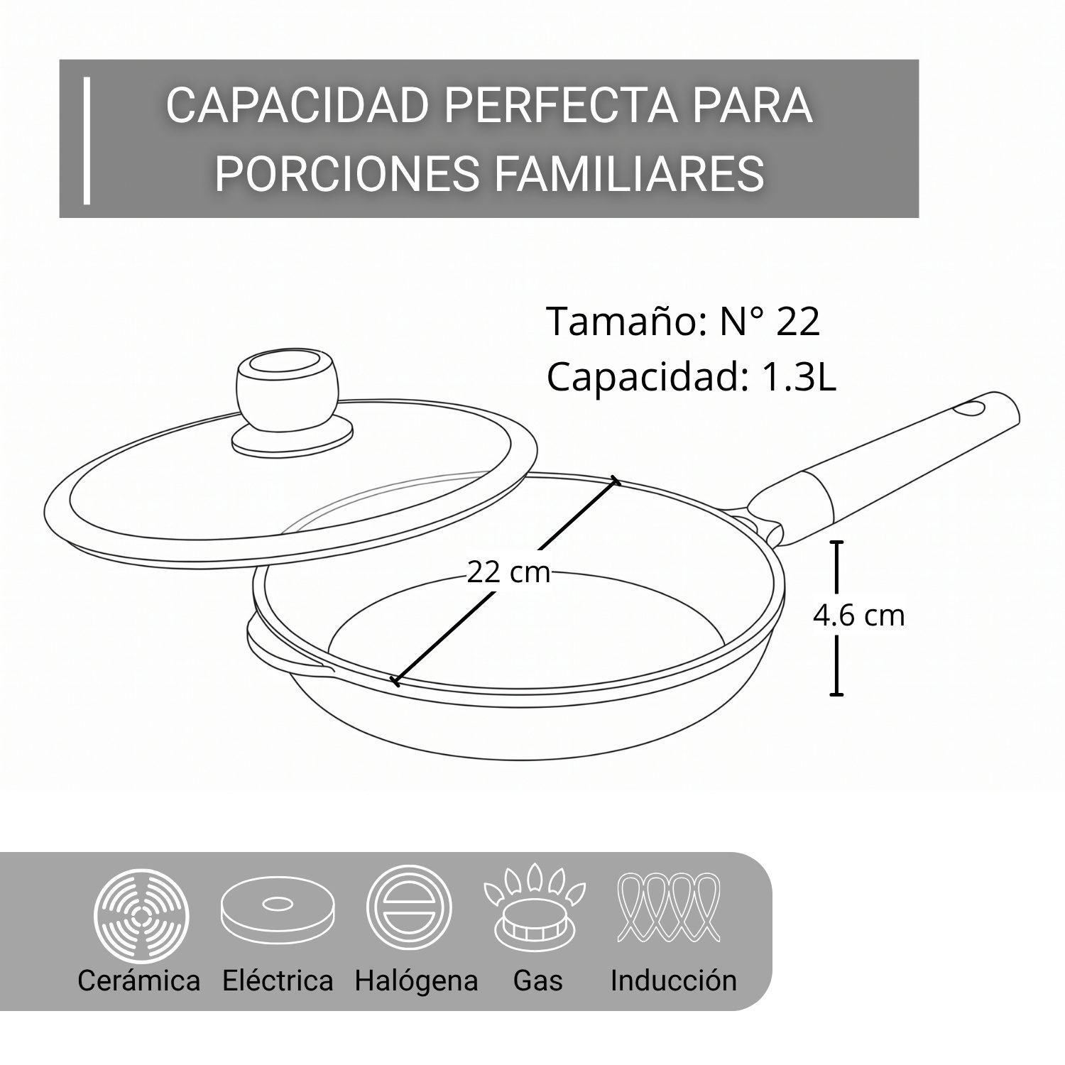 • Diámetro 22 cm: Tamaño funcional para porciones individuales o familiares pequeñas